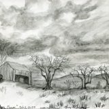 I used my very small sketchbook and drew the sketch above using a permanent ink pen. I did this from life, standing right in front of the tree and wall as you see in the previous photo. I did have my big mittens on with the flip back top so I could use my fingers, but it’s still a challenge to draw!