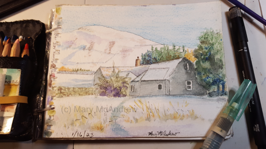Above you can see my little homemade sketchbook, it’s small enough I can also tuck it in my coat pocket. I used a permanent ink pen to do the drawing outside and then took my frozen fingers inside and used watercolor pencils to color it. I looked at a photo I took with my cell phone for reference to help me finish it. You can see the waterbrush I used too. You’ll notice my pencils are all short; I cut them all in half and carry them in a little pouch for taking into the field. Reducing weight is always key to me.