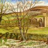 #7 St. Cuthbert’s Mill, Saunders Waterford, 140lb, Rough White 22″x30″ sheet = £ 3.60, 9″x12″ cut peice = .72p. 1. Traces through well-a bit rough. 2. Erases well. 3. Washes- very good. 4. Lifting dry color- worked well but not with sky color. 5. Dry brush- worked great, rough areas in bushes and ground. 6. Ink and Nib- worked ok, a bit rough. 7. Scratch test-worked ok. 8. Color pencil- worked well, especially for rough textures. 9. Permanent ink pen- well but can be bumpy. 10. Clouds- blue wash went on well, clouds did really well. 11. Paper took the paint really well.