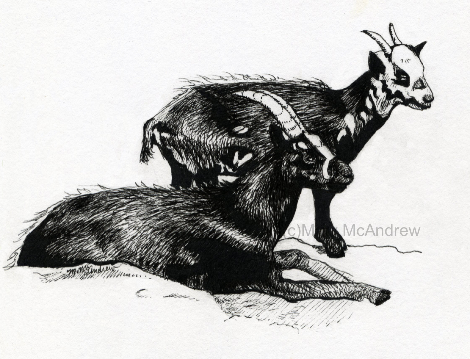 Here’s the ink drawing of the pair. I had to look at photos of other goats to draw the nanny’s feet since you can’t see them in the photo.